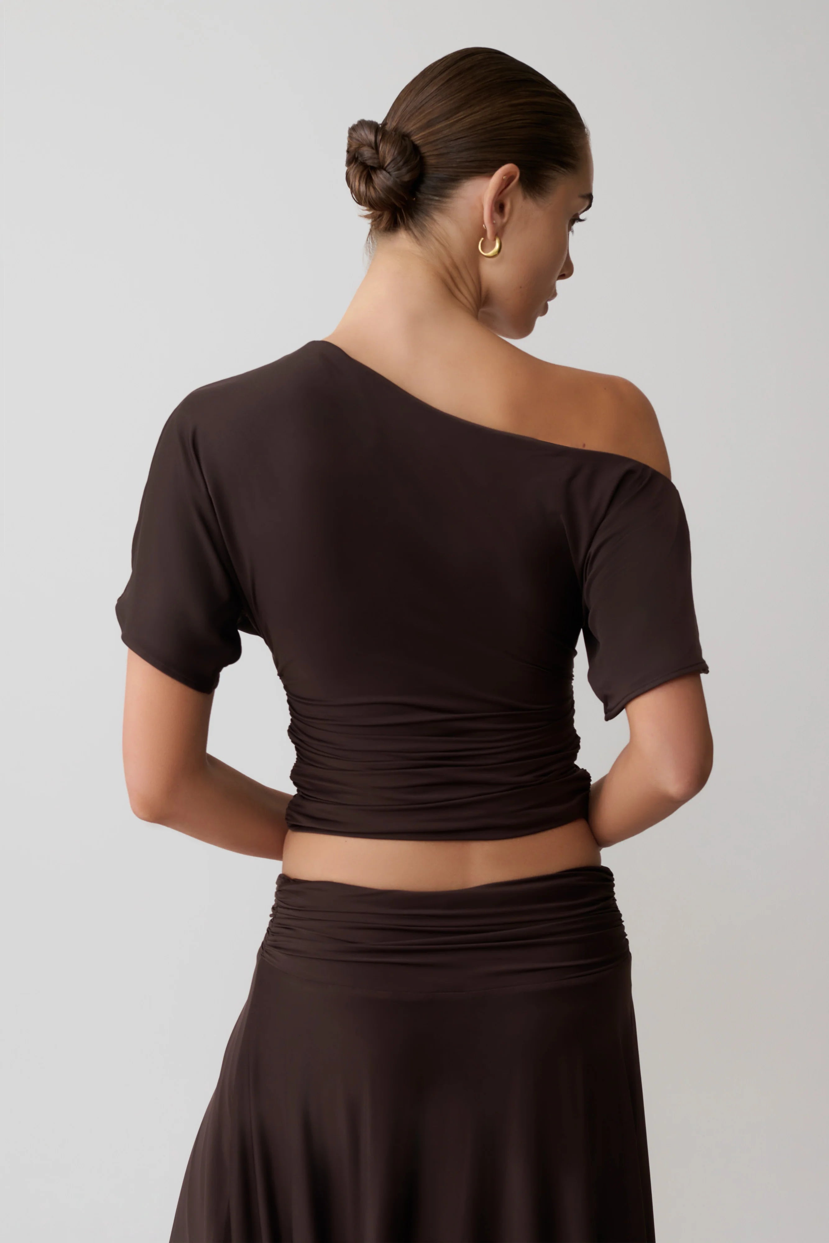 • Open back with ruched detail to centre back